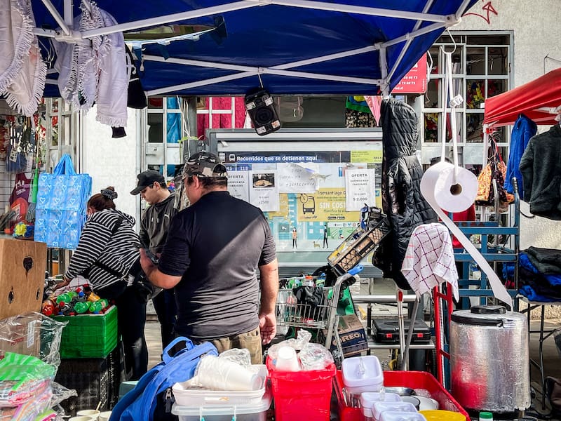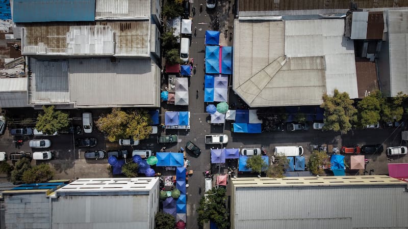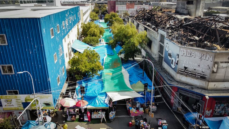 En Salvador Sanfuentes, algunos toldos azules ya no se retiran al final del día, como antes. Ahora, sus dueños duermen ahí mismo, bajo la lona, para evitar robos y asegurar el espacio. La escena se ha vuelto cotidiana: hacen fogatas, se cuelgan de la electricidad y, según relatan los locatarios, serían en su mayoría de nacional china. Todo esto tiene un evidente efecto en los centros comerciales legales del sector.