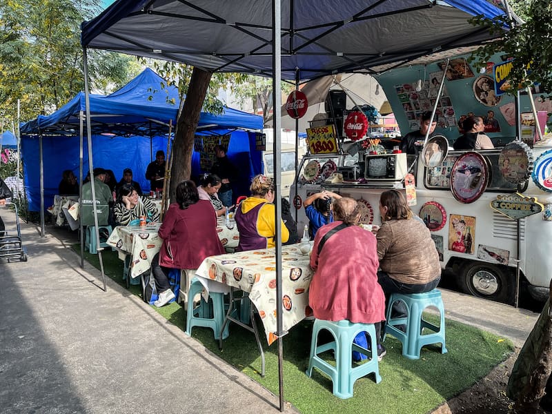 Otros aprovechan una minivan en la vereda de enfrente, también bajo un toldo, que ofrece en sus pancartas de colores diferentes tipos de café y completos a solo $ 1.800.