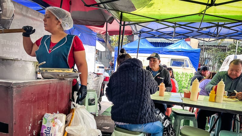 Hace tres meses, sin embargo, Marta descubrió un nuevo atractivo en el sector: antes de volver a casa, a eso del mediodía, se sienta a la mesa en un pequeño puesto de comida, ubicado bajo un toldo azul, en la vereda de la calle San Alfonso con Toesca. “Acá como rico y barato”, dice, mientras una mesera le sirve un plato de arroz con carne y papas fritas, más una ensalada. Todo por $4.500.