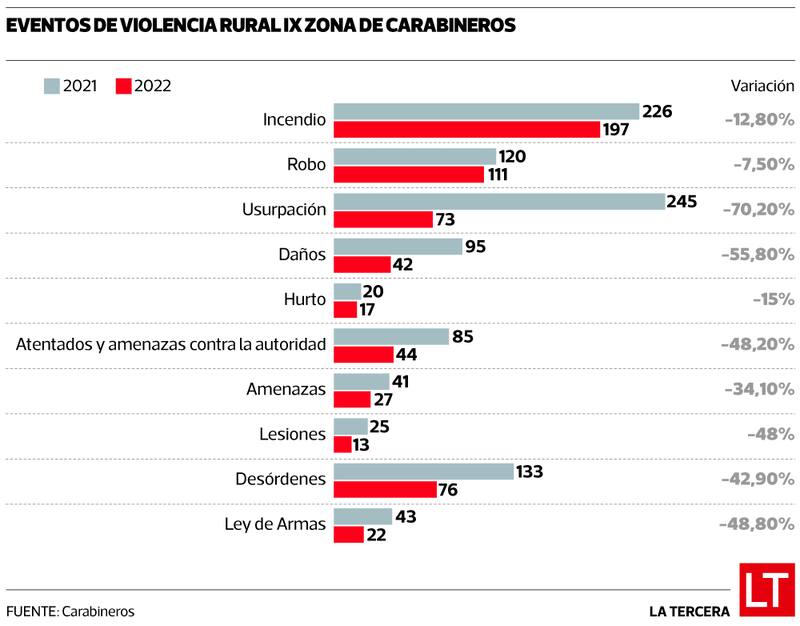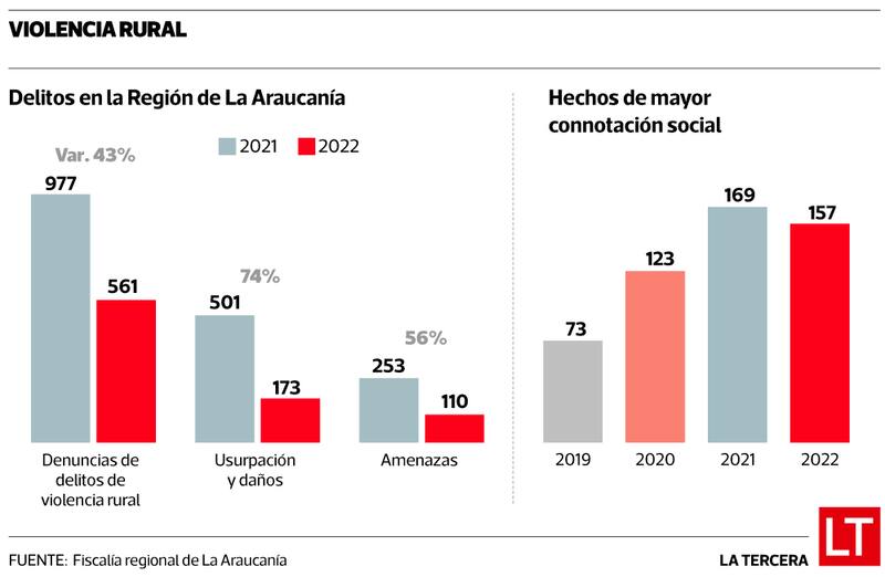 En cifras del Ministerio Público, el año pasado se registraron 416 denuncias menos en los delitos de violencia rural, siendo las usurpaciones de terrenos las que presentan la disminución más grande, con un 74% menos de ilícitos. Lo sigue el delito de amenazas, que baja más de la mitad respecto de lo ocurrido el 2021 y, finalmente, los delitos violentos, como homicidios u ataques armados, caen un 7%.