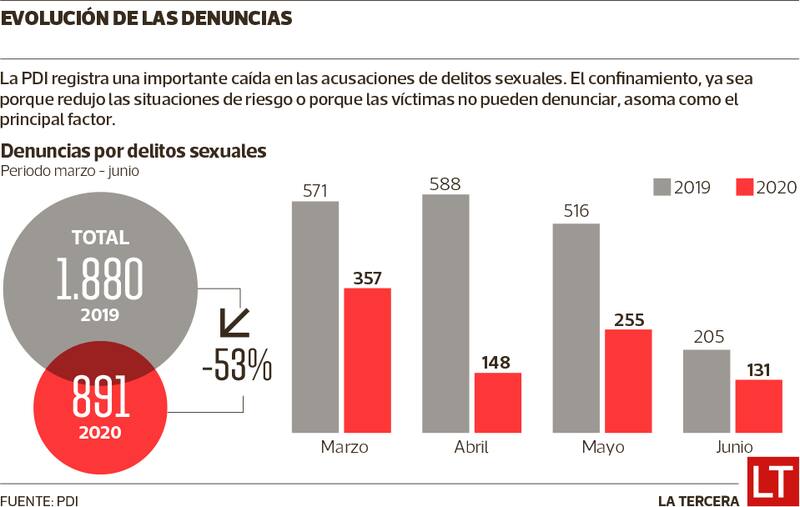 Esta realidad emergió luego de un levantamiento de información que realizó la Jefatura Nacional Contra Delitos Sexuales (Jenades) de la policía civil, la que arrojó que desde marzo hasta junio las denuncias que ha recibido la PDI por delitos sexuales tuvieron una baja de 53%: si en ese mismo periodo de 2019 se registraron 1.880 denuncias, en 2020 la cifra bajó a 891 (ver infografía). El peak de este fenómeno se registró en abril. Durante ese mes, de acuerdo a los registros de Jenades, las denuncias cayeron un 75%. Pese a esta caída, desde la PDI advierten que eso no significa necesariamente que no se estén cometiendo este tipo de ilícitos. “El motivo principal son las cuarentenas obligatorias, ya que creemos que las personas, en general, no estaban denunciando porque tenían disminuida su capacidad de movilizarse”, asegura el jefe de Jenades, prefecto Álex Schwarzenberg.