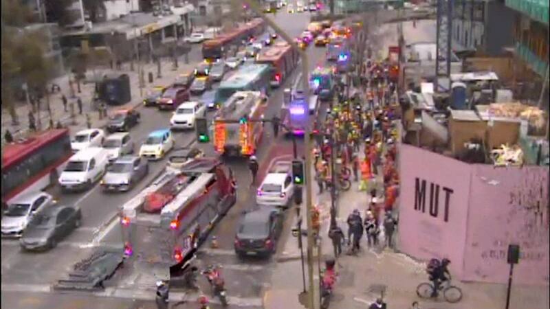 El Ministerio de Transportes dio cuenta de un “importante despliegue de equipos de emergencia” frente a la obra. El tránsito fue suspendido y posteriormente se habilitó la pista izquierda en Apoquindo al poniente desde El Bosque.