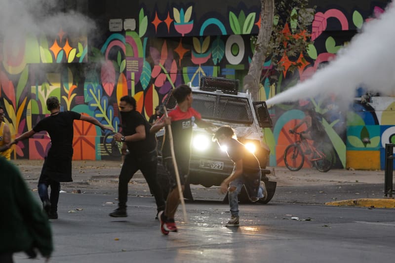 Similar a lo vivido en los días de estallido social, los sujetos levantaron fogatas y barricadas en el sector, y realizaron rayados en la base del monumento de Plaza Baquedano. Personal uniformado se enfrentó a los manifestantes con carros lanza aguas y lanza gases.