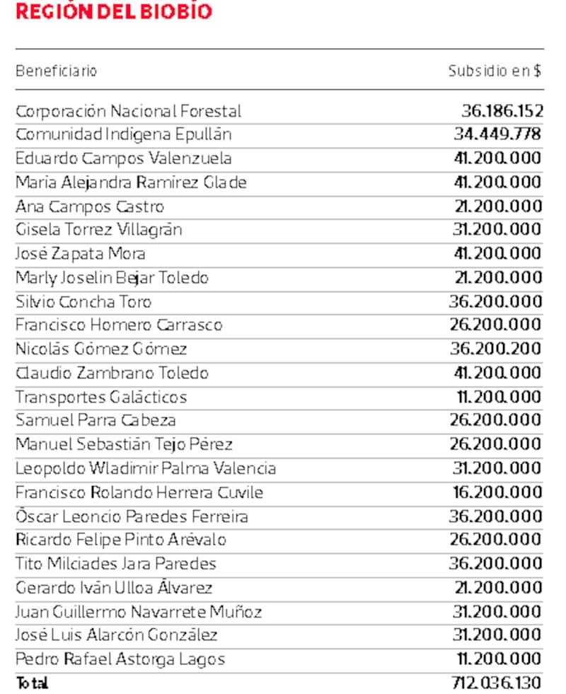 En el caso de esta región, uno de los mayores montos comprometidos es al empresario Eduardo Campos Valenzuela, ligado al cultivo de trigo, en Cañete, quien recibirá $ 41,2 millones.
