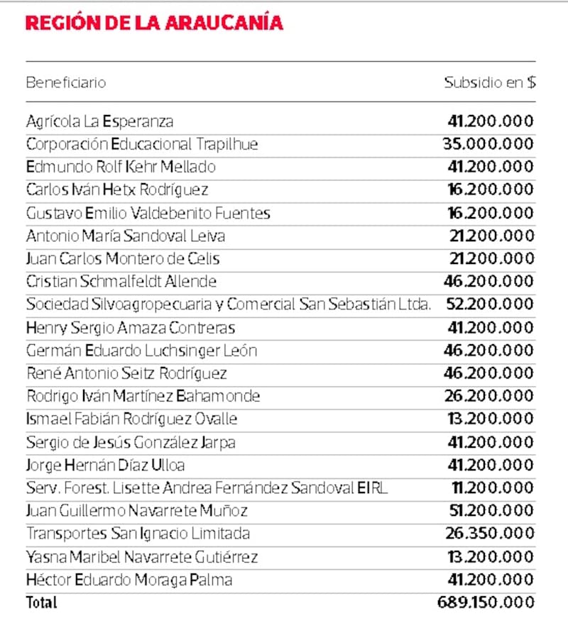 En La Araucanía son 21 beneficiarios con estos fondos de ayuda, por un total de $689 millones. Por ejemplo, una de las empresas que más recursos recibirá es la Sociedad Silvoagropecuaria y Comercial San Sebastián Ltda., para quienes fue aprobado un fondo de $ 51,2 millones, luego de que una de sus bodegas destinada a la barraca y acopio de madera, en la comuna de Padre Las Casas, fuera incendiada por desconocidos.