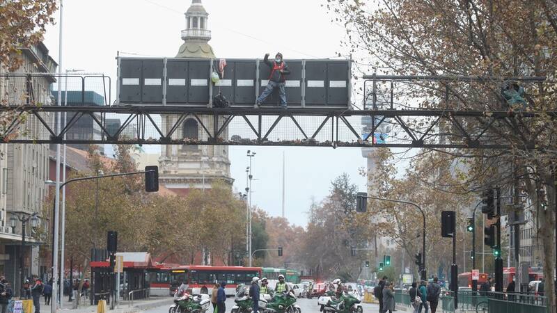 Un hombre subió a una estructura de señalética que atraviesa la Alameda Libertador Bernardo O’Higgins como protesta la mañana de este viernes.