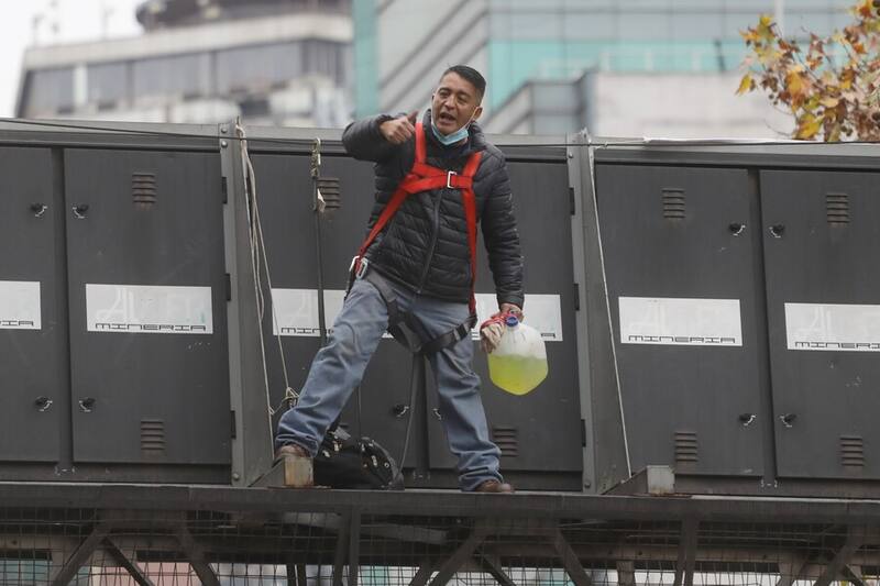 Antes de las 9.00 horas, el sujeto provisto de un arnés y con un bidón, presumiblemente de un líquido acelerante, trepó la estructura ubicada a la altura de avenida Santa Rosa. El martes había realizado la misma acción extrema de protesta en ese lugar.