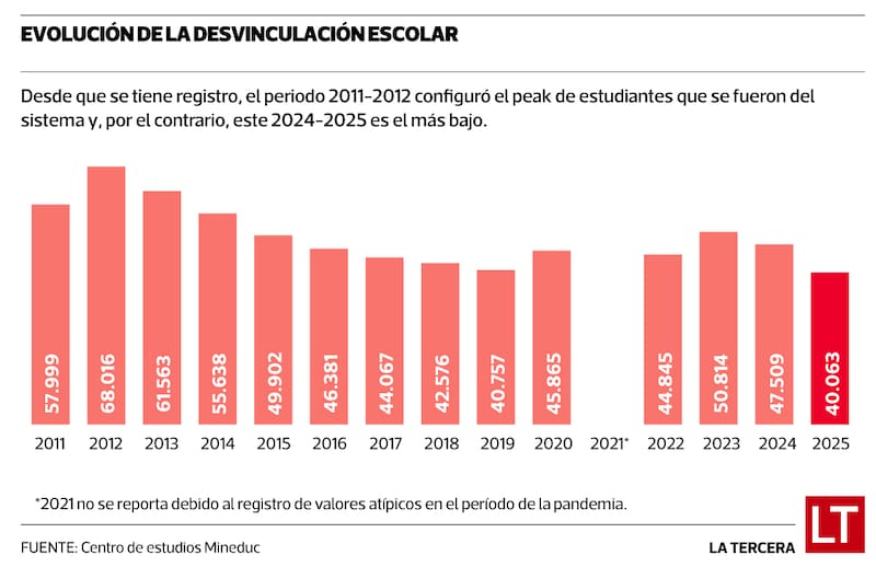 Eso al menos dicen las cifras del Centro de Estudios del Mineduc a las que tuvo acceso La Tercera, las que indican que de 2024 a 2025 se fueron del sistema 40.063 estudiantes (1,3% del total), lo que representa la cifra más baja desde que existen registros en 2010.