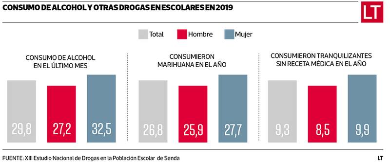 La última encuesta nacional de Senda estableció que las jóvenes de octavo a cuarto medio superaron a los varones en el uso de alcohol, marihuana y tranquilizantes sin receta médica. Las cifras alarman a los expertos, mientras los estudiantes secundarios chilenos se ubican como líderes en el continente frente al uso de sustancias.
