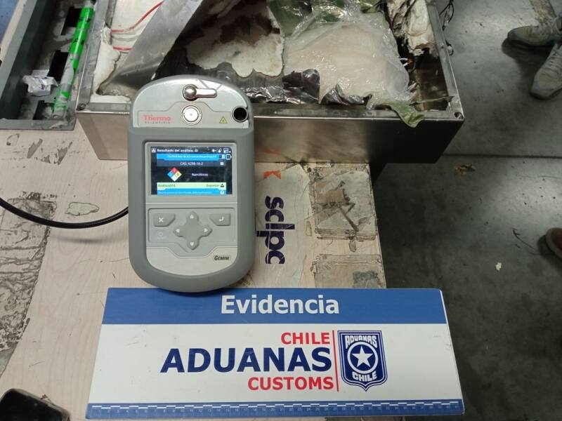 Al revisar el paquete, los fiscalizadores encontraron dos bultos con una sustancia blanquecina en polvo ocultos en las paredes de la máquina. Luego de analizar la sustancia con el instrumento especializado Gemini, se confirmó que ésta correspondía a clorhidrato de metanfetamina y que su peso alcanzaba los 5.700 gramos.