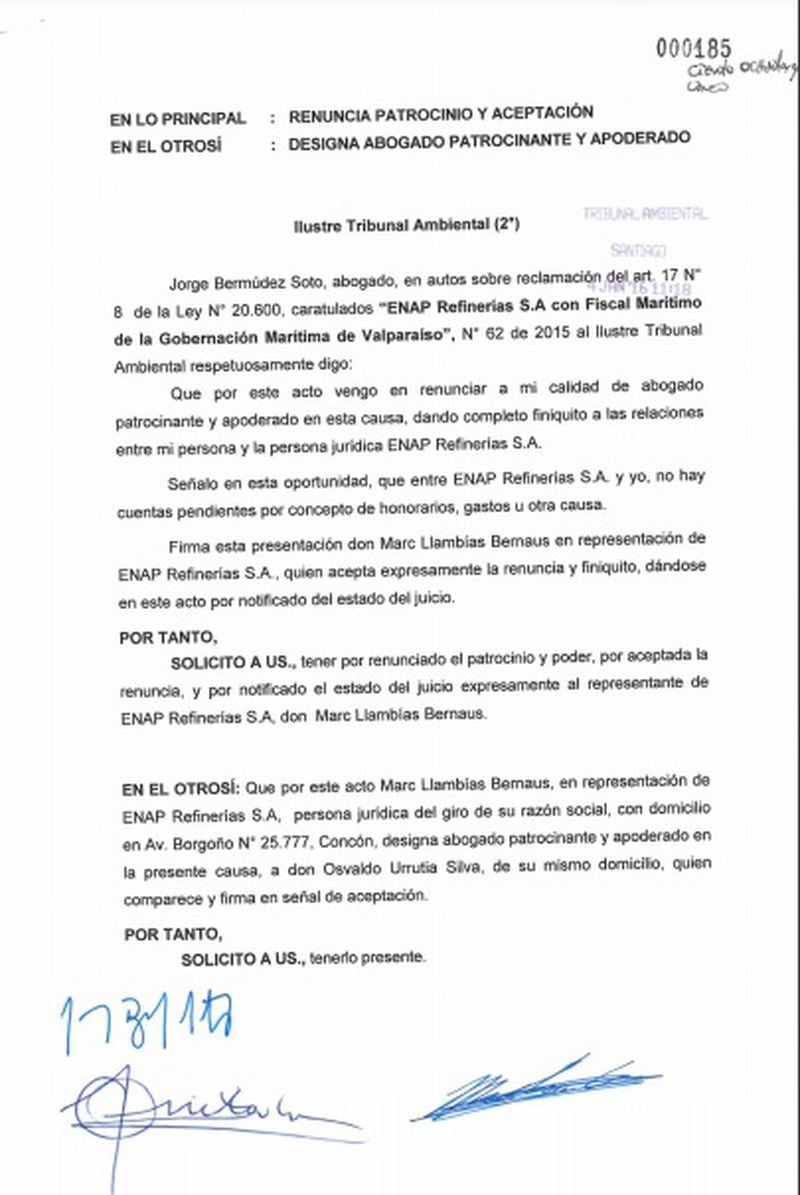 El 26 de febrero de 2015 Enap presentó ante el Tribunal Ambiental de Santiago una reclamación en contra de la resolución del fiscal marítimo de Valparaíso, que rechazó un recurso de reposición interpuesto por la empresa contra del dictamen del 26 de noviembre de 2014. El documento fue presentado en ese entonces por el abogado Jorge Bermúdez Soto, quien meses después asumiría como Contralor General de La República.
