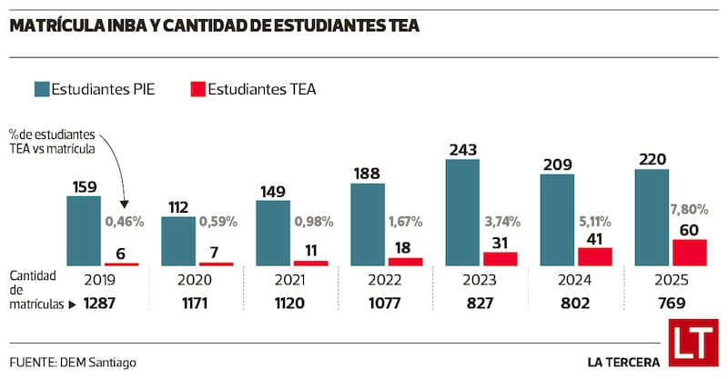 Eso sí, un 28% de la matrícula actual del INBA son estudiantes PIE: 220 de 769. En el Instituto Nacional, para hacer una comparación, la matrícula 2024 fue de 3.198 alumnos. De ellos, 423 (13%) eran PIE, y 58 (1,8%) eran TEA.