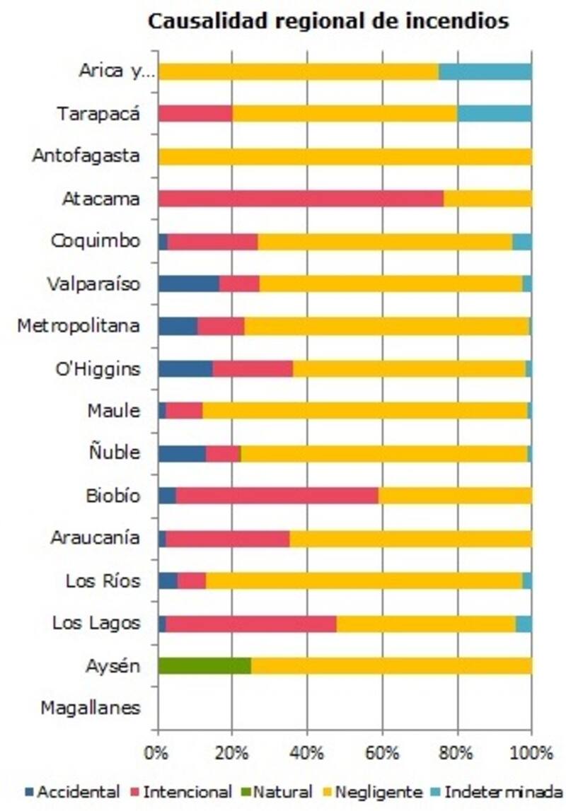 Hasta aquí, por ejemplo, hay regiones con amplia preponderancia de incendios por personas negligentes, como en Antofagasta, el Maule o Los Ríos. En todas superan el 80%. En Atacama, en tanto, casi el 80% corresponde a intencionales.