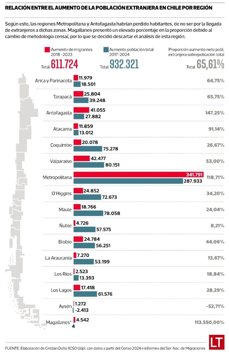 Según un análisis del académico del Instituto de Investigación en Ciencias Sociales de la Universidad Diego Portales (ICSO Udp), Cristian Doña, la cantidad de extranjeros también aumentó en prácticamente todas las regiones. Incluso, de no ser por el factor migración, algunas regiones habrían perdido habitantes. ¿Cuáles son las posibles causas y consecuencias de que las cifras demográficas en Chile se completen con ayuda foránea?