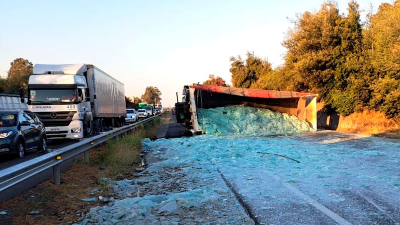 La carga de vidrio que transportaba el vehículo mayor quedó esparcida en la ruta, por lo que el tránsito hacia el norte está siendo desviado a la altura del km 220, en la salida Camarico.