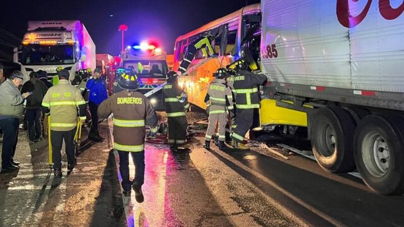La noche de este viernes se registró un violento choque entre un bus y un camión en la Ruta 5 Sur, a la altura de Paine, en la Región Metropolitana, lo que dejó al menos dos víctimas fatales, pertenecientes a la tripulación del vehículo de pasajeros.