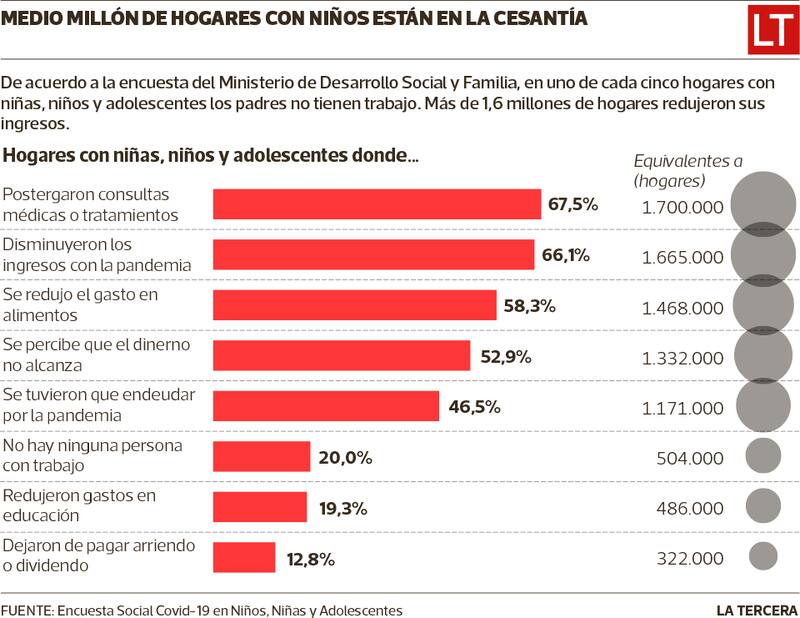 Llevado a la realidad nacional, esto quiere decir que en más de 1,3 millones de hogares con niñas, niños y adolescentes sus ingresos no les son suficientes. Y la situación podría ser más crítica si se considera que el 66,1% de los hogares con hijos disminuyó sus ingresos, equivalentes a más de 1,6 millones de hogares.