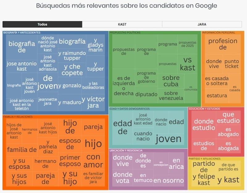 Hay un aspecto curioso y que tiene relación con las búsquedas más relevantes sobre los candidatos en Google, con una amplia diversidad de interrogantes en siete categorías: biografía y antecedentes; propuestas políticas; educación y estudios; familia y relaciones; información personal; partido y afiliaciones; y edad y datos.