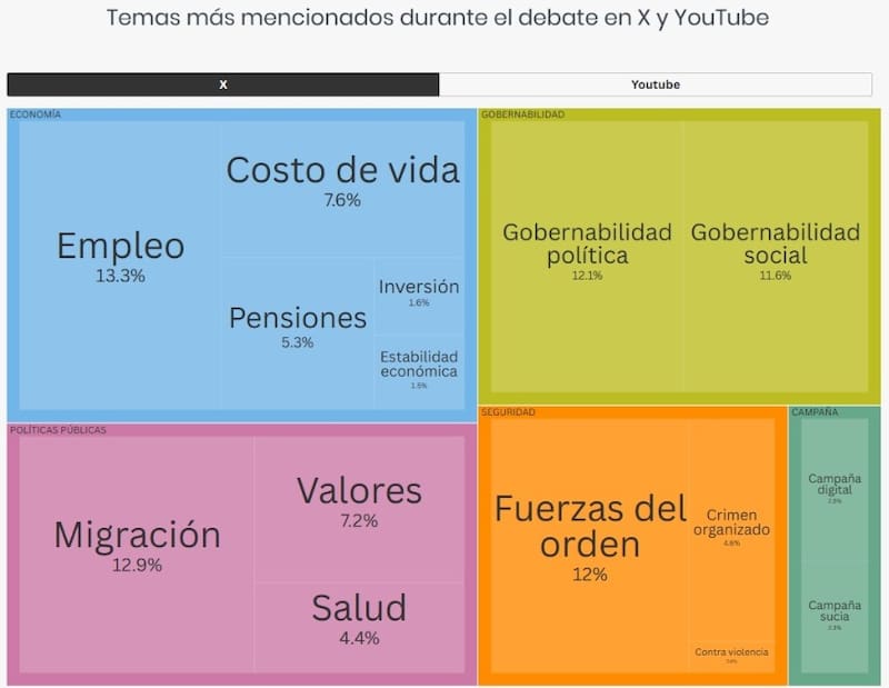 Por otro lado, los temas más mencionados en X durante las horas que duró el debate fueron “empleo” (13,3%), “migración” (12,9%), “gobernabilidad política” (12,1%), “fuerzas del orden” (12%) y “gobernabilidad social” (11,6%).