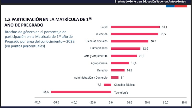 “La participación en la matrícula de primer año en pregrado en las carreras STEM refleja importantes brechas de género, con carreras fuertemente masculinizadas”, detalló, con brechas negativas cercanas a -61 puntos porcentuales en el promedio para el período 2018-2022 y que no muestra grandes variaciones tampoco durante el período.