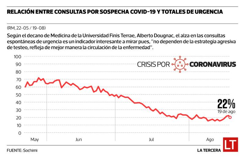 En los últimos cuatro días, las consultas de urgencia en la Región Metropolitana han registrado una variación: si hasta el domingo el 15% eran por sospecha de coronavirus, la proporción ha ido al alza, llegando ayer al 22%. Así lo revela el informe que elabora la Sociedad Chilena de Medicina Intensiva (Sochimi), con el reporte de toda la red asistencial.