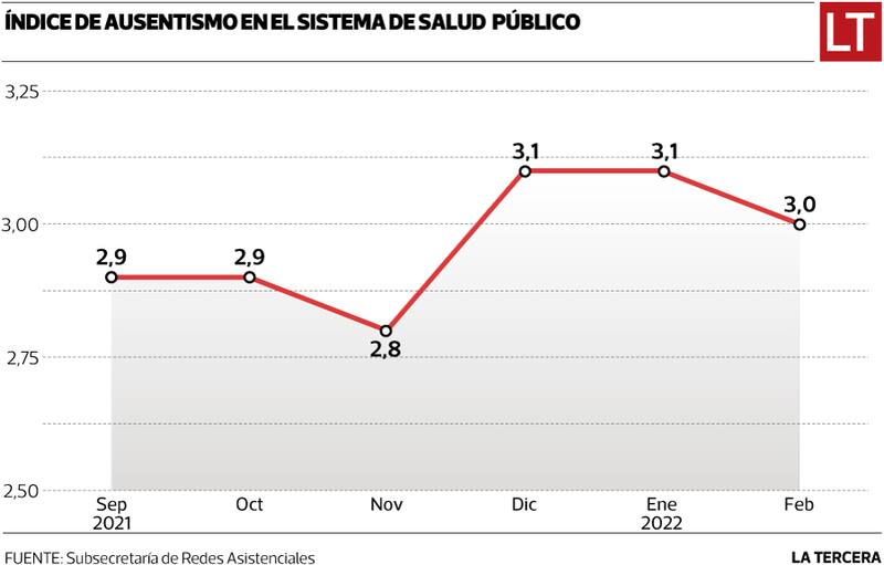 Según las cifras de la Subsecretaría de Redes Asistenciales, que abarca los últimos seis meses, en promedio cada funcionario de salud se ausenta tres días al mes (ver gráfico). Además, las licencias médicas entre el personal sanitario también aumentaron, ya que si en septiembre de 2021 se emitieron 36.138, en febrero de este año fueron 43.471, es decir, se registra un incremento del 20%