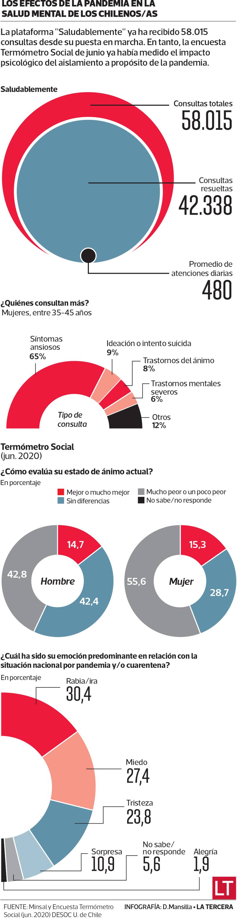 El diagnóstico del Minsal va en línea con la encuesta “Termómetro Social” del Núcleo Milenio en Desarrollo Social (Desoc) de la Universidad de Chile, que el mes pasado evaluó los efectos emocionales y sicológicos de la emergencia sanitaria y el confinamiento en los chilenos.