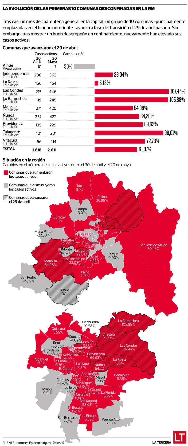 Y es que en ese escenario epidemiológico, los números lo permitían: comparativamente, al menos seis de esas 10 comunas habían logrado bajar radicalmente sus casos durante la cuarentena y todas se ubicaban en el bloque oriente de la capital. Las Condes, por ejemplo, a los 22 días de dictada la cuarentena contaba con solo 314 casos activos de coronavirus, lo que representaba un 45% menos de personas contagiantes desde que empezó la fase de aislamiento en la región.