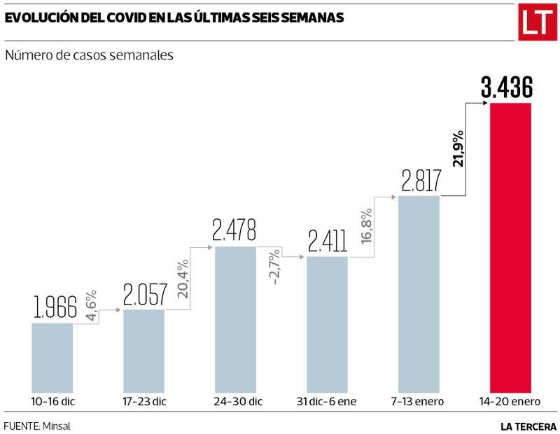 Aunque ya no es el principal problema sanitario, el Covid-19 sigue activo. Incluso, en el último tiempo, los reportes semanales han dado cuenta de un aumento en los contagios. De acuerdo a la última actualización, entre el 14 y 20 de enero se registraron 3.436 nuevos contagios confirmados, es decir, un promedio diario de 491 casos, lo que produce un aumento 74,7% con las cifras de hace un mes, cuando se contabilizaron 1.966 pacientes de coronavirus en la semana del 10 al 16 de diciembre, es decir, 281 casos al día.