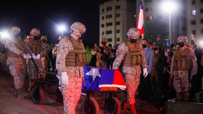 En una pequeña urna, cubierta por el pabellón patrio, los restos fueron retirados esta noche de la Plaza Baquedano y transportados en un jeep custodiado por vehículos de Carabineros hasta la referida unidad militar, en medio de manifestantes que portando banderas expresaron su adhesión a este acto del Ejército.