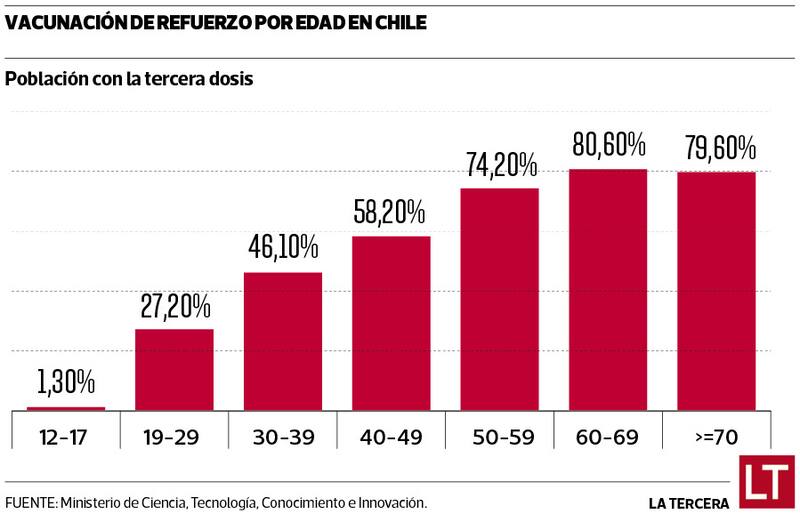 A nivel nacional, la región que más ha avanzado con el refuerzo es Magallanes, pues el 49,4% de su población ya se inmunizó con esta dosis, es decir casi la mitad de sus habitantes. Después vienen Ñuble y Valparaíso, con el 47,7% y el 46,8%, respectivamente.
