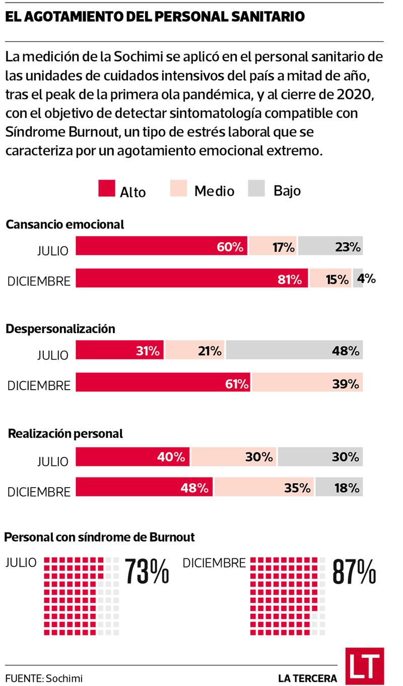 Así lo demostró la medición realizada por la Sociedad de Medicina Intensiva (Sochimi), que evaluó la afectación de los trabajadores ante la emergencia sanitaria, y que encontró, además, que esta condición se ha masificado: en julio, al término del primer peak, el 73% de los trabajadores declaraba este trastorno.