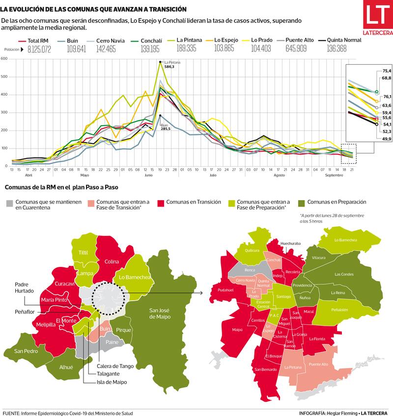 Otras 12 comunas -Tiltil, Calera de Tango, Talagante, Lo Barnechea, Estación Central, Peñalolén, Padre Hurtado, Pedro Aguirre Cerda, Lampa, Isla de Maipo, Santiago y Quilicura- avanzaron de Transición a Preparación, lo que elimina, entre otras restricciones, la cuarentena que rige durante los fines de semana y la prohibición de abrir bares y restaurantes.