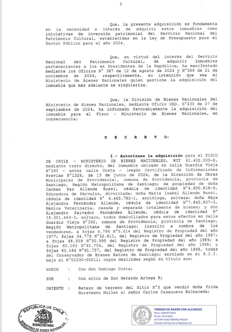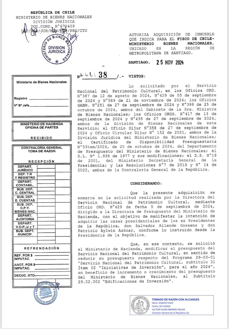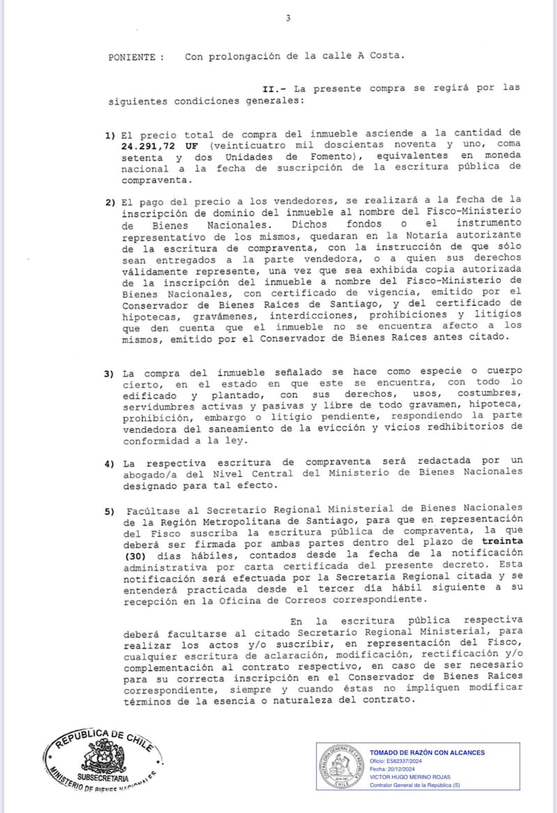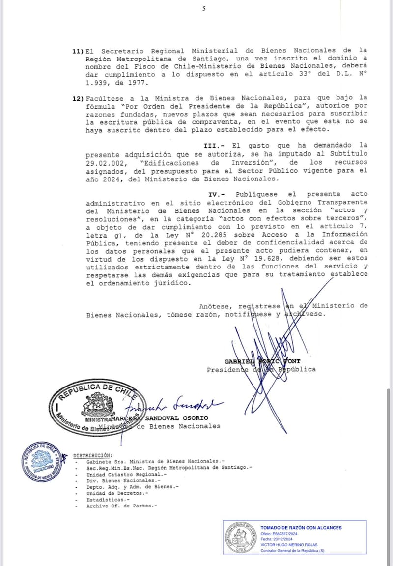 El decreto de cinco páginas del Departamento Jurídico del Ministerio de Bienes Nacionales que autoriza la adquisición del inmueble tiene fecha del 25 de noviembre de 2024.