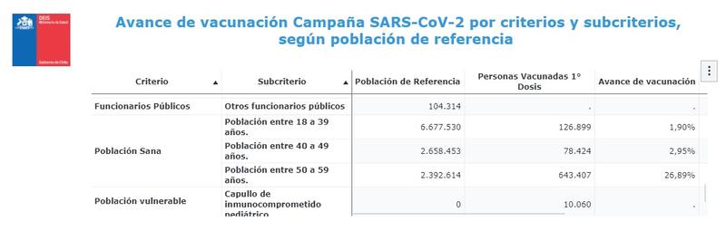 De hecho, en la estadística general proporcionada por el mismo DEIS, el grupo total -con y sin comorbilidades- aparece con 1.710.775 personas con primera dosis, el 72,4% de la población. Pero el análisis hecho por el DEIS en el subsegmento de población sana no hace la diferencia de excluir a quienes están en grupos de población crónica o vulnerable.