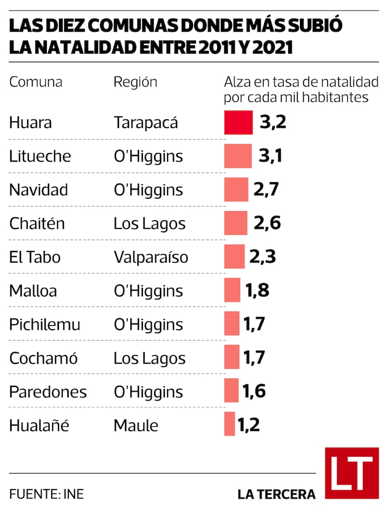 Algo está pasando en Huara. En esa comuna de alrededor de tres mil personas, en medio de la provincia del Tamarugal, en Tarapacá, nacen, en proporción, más chilenos que en cualquier otra parte del país. Ahí se registran 16,1 nacimientos por cada mil habitantes. No sólo eso: entre 2011 y 2021 Huara fue la localidad donde más aumentó la fecundidad, con un alza de 3,2 nacimientos cada mil habitantes, en esos 10 años. Bastante por sobre otras con altas tasas de nacimientos, como Alhué (15,4), Ercilla (15,2) y Lampa (13,7). Este fenómeno, sin embargo, es bastante reducido. Sólo en 18 de las 346 comunas medidas, subió la fecundidad en ese período.