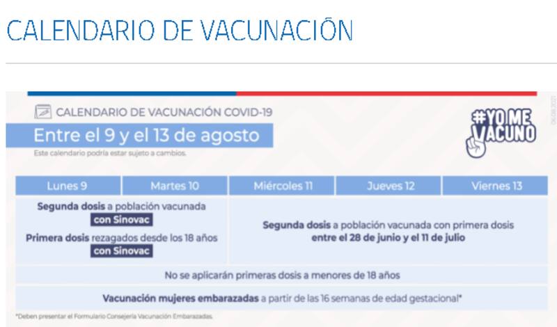 Entre el 11 y el 13 de agosto se proporcionará la dosis de refuerzo a adultos mayores desde los 79 años que hayan recibido su segunda dosis de Sinovac entre el 1 y el 14 de marzo. Asimismo, recibirá la tercera dosis parte de los pacientes inmunocomprometidos desde los 16 años. La semana entre el 16 y 20 de agosto corresponderá el turno de las personas entre 55 y 78 años y a otro grupo de pacientes con el sistema inmunológico comprometido.