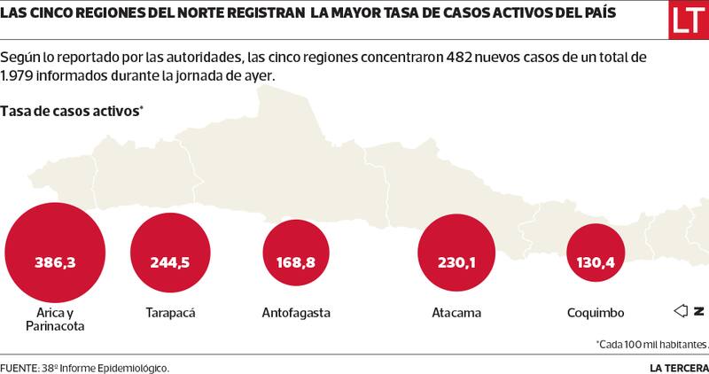 Hoy, de los 1.979 casos nuevos reportados a nivel nacional, 482 correspondían a Arica, Tarapacá, Antofagasta, Atacama y Coquimbo, con un 24,3% de los nuevos positivos totales de coronavirus. Esas regiones tienen el 12,73% de la población del país.