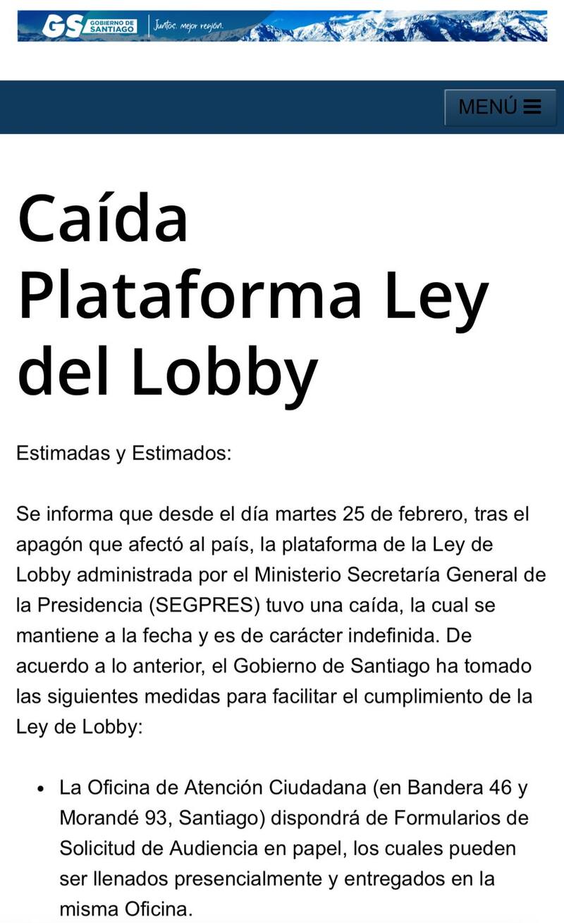 La mayoría de estos comunicados señala que “desde el martes 25 de febrero, tras el apagón que afectó al país, la plataforma de la Ley de Lobby, administrada por el Ministerio Secretaría General de la Presidencia (Segpres), sufrió una caída, la cual se mantiene a la fecha y es de carácter indefinido”.