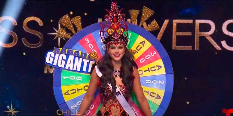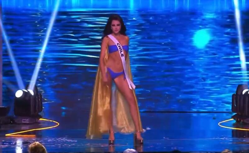 Ya cerca de las dos de la madrugada local, la chilena se presentó en traje de gala, luego de que los presentadores del concurso las hicieran pasar en grupos de seis mujeres sobre la pasarela.