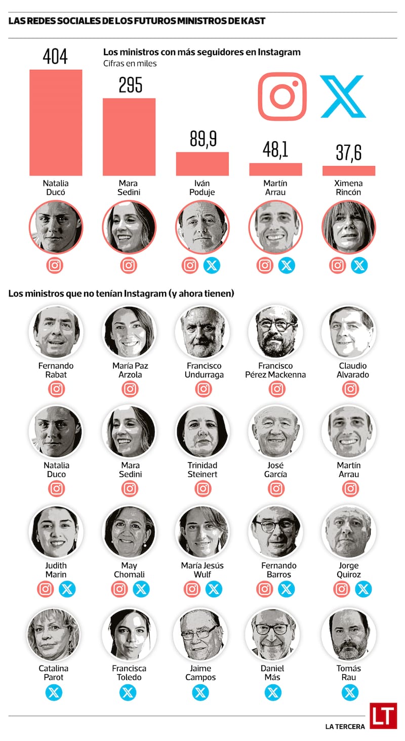 El viernes pasado La Tercera ya contó que a los 13 ministros que no tenían un perfil en esa red social se les hizo uno, lo que da cuenta de la relevancia que tiene para el futuro gobierno republicano el arma comunicacional que supone el uso de las redes sociales, con un presidente electo muy activo en dichas aplicaciones: en Instagram tiene 1 millón de seguidores y en X 938 mil. Las redes sociales jugarán un papel preponderante en la campaña comunicacional del futuro gobierno, mismo que jugó en el largo camino de Kast a La Moneda.
