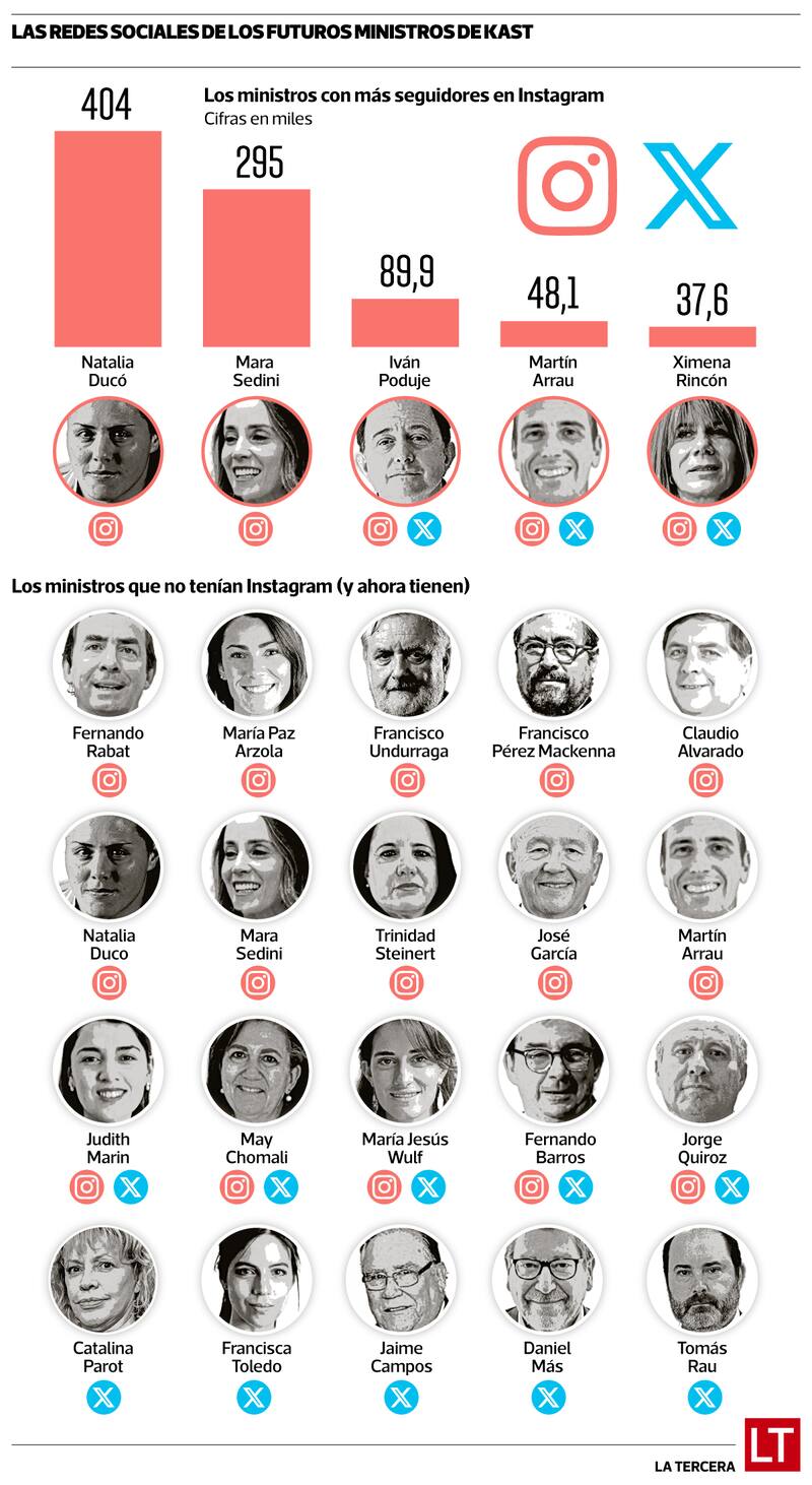 El viernes pasado La Tercera ya contó que a los 13 ministros que no tenían un perfil en esa red social se les hizo uno, lo que da cuenta de la relevancia que tiene para el futuro gobierno republicano el arma comunicacional que supone el uso de las redes sociales, con un presidente electo muy activo en dichas aplicaciones: en Instagram tiene 1 millón de seguidores y en X 938 mil. Las redes sociales jugarán un papel preponderante en la campaña comunicacional del futuro gobierno, mismo que jugó en el largo camino de Kast a La Moneda.