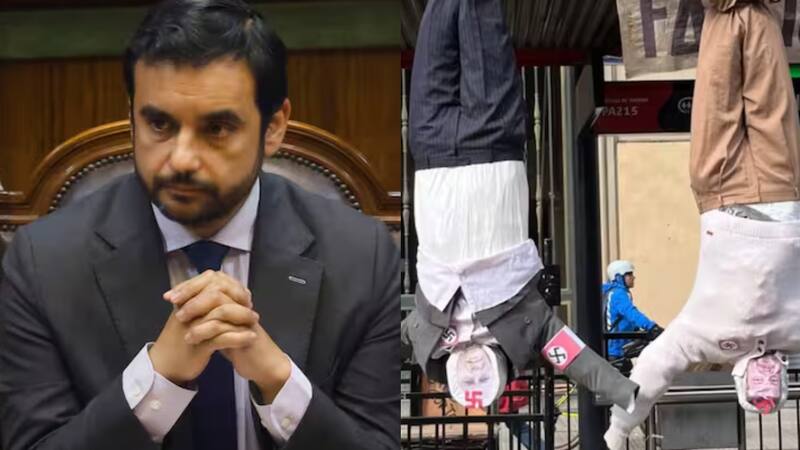 Ambos muñecos portaban un brazalete con esvásticas nazis y emulaban los cadáveres del líder fascista Benito Mussolini y sus adherentes, que fueron colgados en una plaza pública de Milán tras ser fusilados el 28 de abril de 1945.