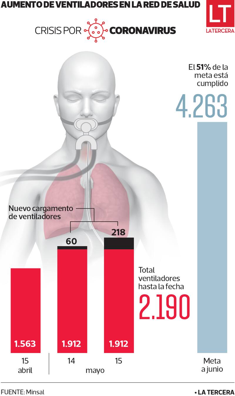 Con esto, la cantidad total de ventiladores disponibles a nivel país ascenderá a 2.190. Pero el Minsal aún está lejos de cumplir la meta que se fijó en abril, y que consiste en llegar a mediados de junio con un stock de 4.263 respiradores.