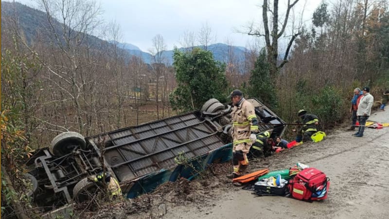 Este sábado, se volcó un bus con más de 40 pasajeros cerca de las termas de Manquecura, en la región de Los Ríos.