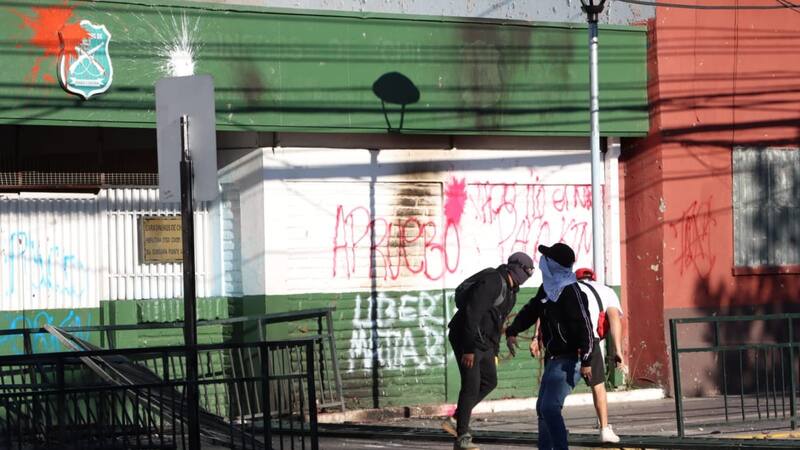 Sujetos a rostro cubierto arrojaron elementos contundentes contra el edificio policial durante manifestaciones por el aniversario del 18 de octubre.