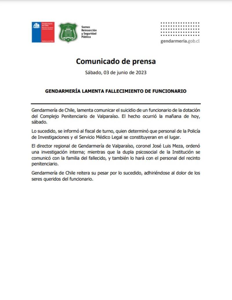 “Gendarmería de Chile reitera su pesar por lo sucedido, adhiriéndose al dolor de los seres queridos del funcionario”, finaliza el documento.