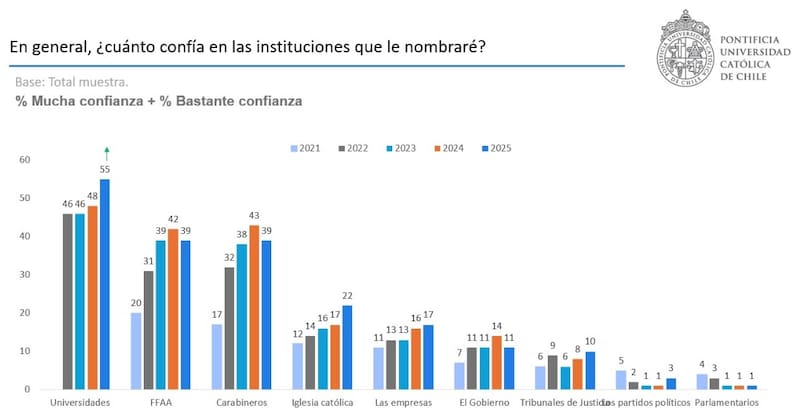 No es el gobierno, ni las empresas, ni los partidos políticos. Tampoco los tribunales de justicia o los parlamentarios: acorde a la vigésima Encuesta Bicentenario UC 2025, elaborada por el Centro de Políticas Públicas y la Facultad de Ciencias Sociales de la Universidad Católica, las instituciones en que más confían los chilenos son las universidades y empatados en segundo lugar Fuerzas Armadas y Carabineros.