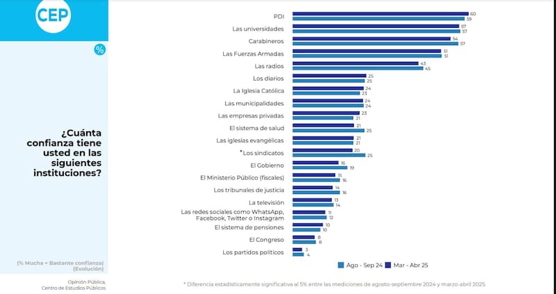 Por otra parte, los sindicatos presentaron una notoria baja en el estudio: de 25 a 20%, siendo la única institución que disminuyó cinco puntos porcentuales en diferencia a la última versión de la encuesta de agosto y septiembre 2024.