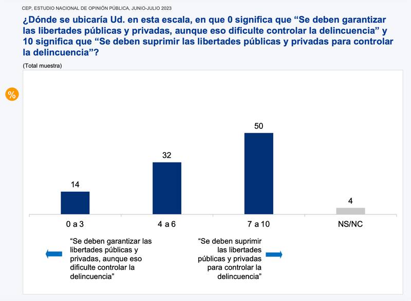 En contraste, un 14% indicó que era prioridad que se garanticen las libertades públicas y privadas, aunque eso dificulte controlar la delincuencia, y un 32% se encuentra en una situación intermedia.